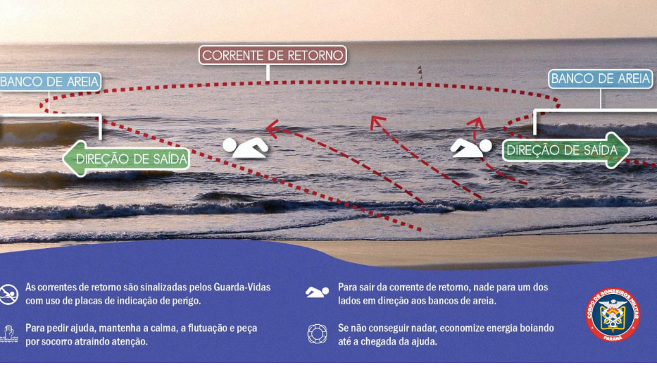 O Corpo de Bombeiros Militar do Paraná (CBMPR) reforça aos turistas de férias no Litoral que é preciso estar atento às correntes de retorno no mar, um fenômeno responsável por muitos incidentes de afogamento. Este tipo de corrente é formada pelo retorno da água que chega à faixa de areia com as ondas.
